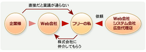 私のようなフリーランスは、プロジェクト単位の仕事の参加という形をとらせていただいていることが多く、そのプロジェクトをWeb会社が持ってきたか、私が持ってきたかの違いで、Web会社にはあまり支障はないようです。下手すると、私の苦手分野は別の人がフォローしてくれることもあるので、助かることが多いですね。